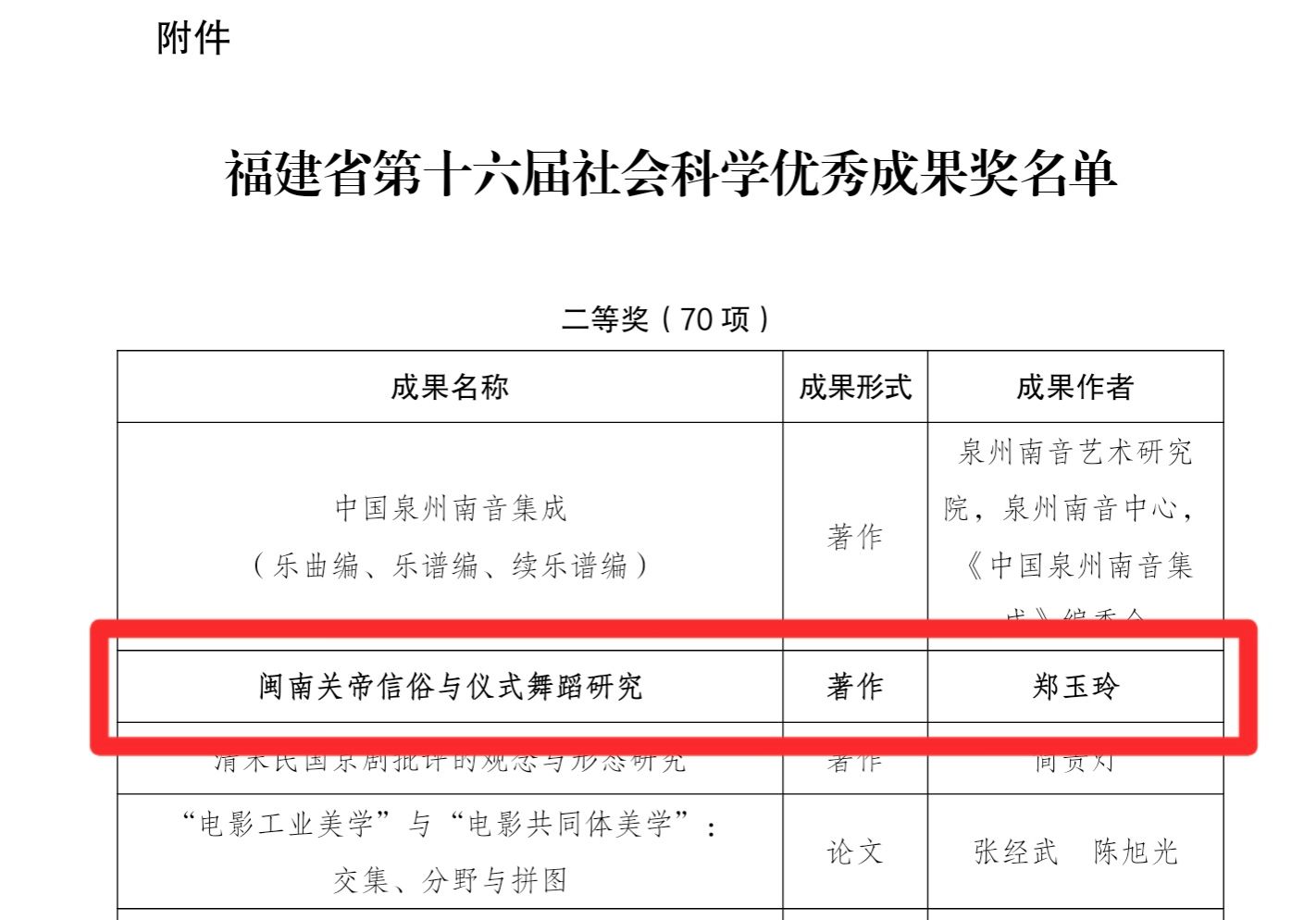 近日,福建省人民政府正式颁布《福建省人民政府关于颁发福建省第十六届社会科学优秀成果奖的决定》(闽政文〔2025〕294号),我院郑玉玲教授的著作《闽南关帝信俗与仪式舞蹈研究》荣获二等奖。